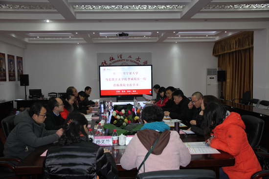 邱杰院长代表学院对宁夏大学十大买球官方网站的来访表示热烈的欢迎,简要介绍了学院的发展历程、学科建设、师资队伍、课程建设、研究生培养等基本情况,并就重点十大买球官方网站建设和如何提高思想政治理论课教学课堂教学质量进行了交流。双方还就思想政治理论课教学改革、实践教学、考试改革等教学相关问题进行了深入交流和讨论。