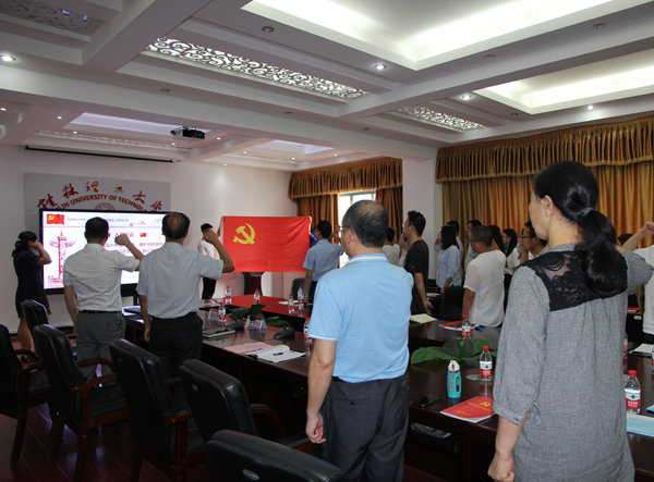 为庆祝建党98周年,回顾党的光辉历程,弘扬革命传统,传承红色基因,激励广大党员干部坚定理想信念,不忘初心,牢记使命,7月1日上午,学院在07415会议室开展了以“追溯桂林革命历史,牢记使命任务”为主题的党日活动,学院全体党员参加了会议,会议由学院党委书记王青山主持。
