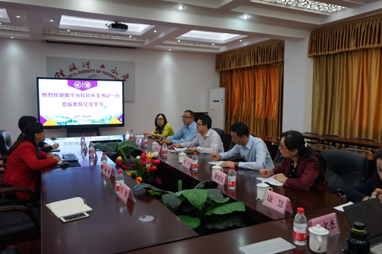 4月28日上午,南宁分校党委书记白永生和基础学科部教师一行7人到十大买球官网进行考察交流。学院副院长梁英及相关教师在雁山07415会议室与来访老师进行交流。 梁英副院长对白永生书记等教师的到访表示热烈欢迎,并介绍了十大买球官网在学科建设、师资队伍、教学建设等方面的基本情况,并就如何提高思想政治理论课教学课堂教学质量进行了交流。双方还就思想政治理论课教学改革、实践教学、考试改革等教学相关问题进行了深入交流和讨论。
