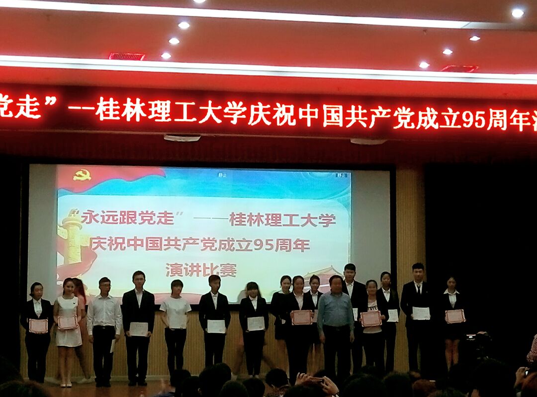 为庆祝中国共产党成立95周年,推动“两学一做”学习教育及“感恩教育”主题活动深入开展,加深大学生对党的了解和认识,进一步增进大学生对党、对祖国、对人民的热爱之情,5月10日晚,学校党委在雁山校区图书馆报告厅组织举办了“永远跟党走”---庆祝中国共产党成立95周年演讲比赛。学校党委常委、副校长梁福沛出席比赛活动并为获奖选手颁奖。党委组织部、宣传部、学工部、研工部、团委等部门负责人和各二级学院师生代表参加了本次活动。