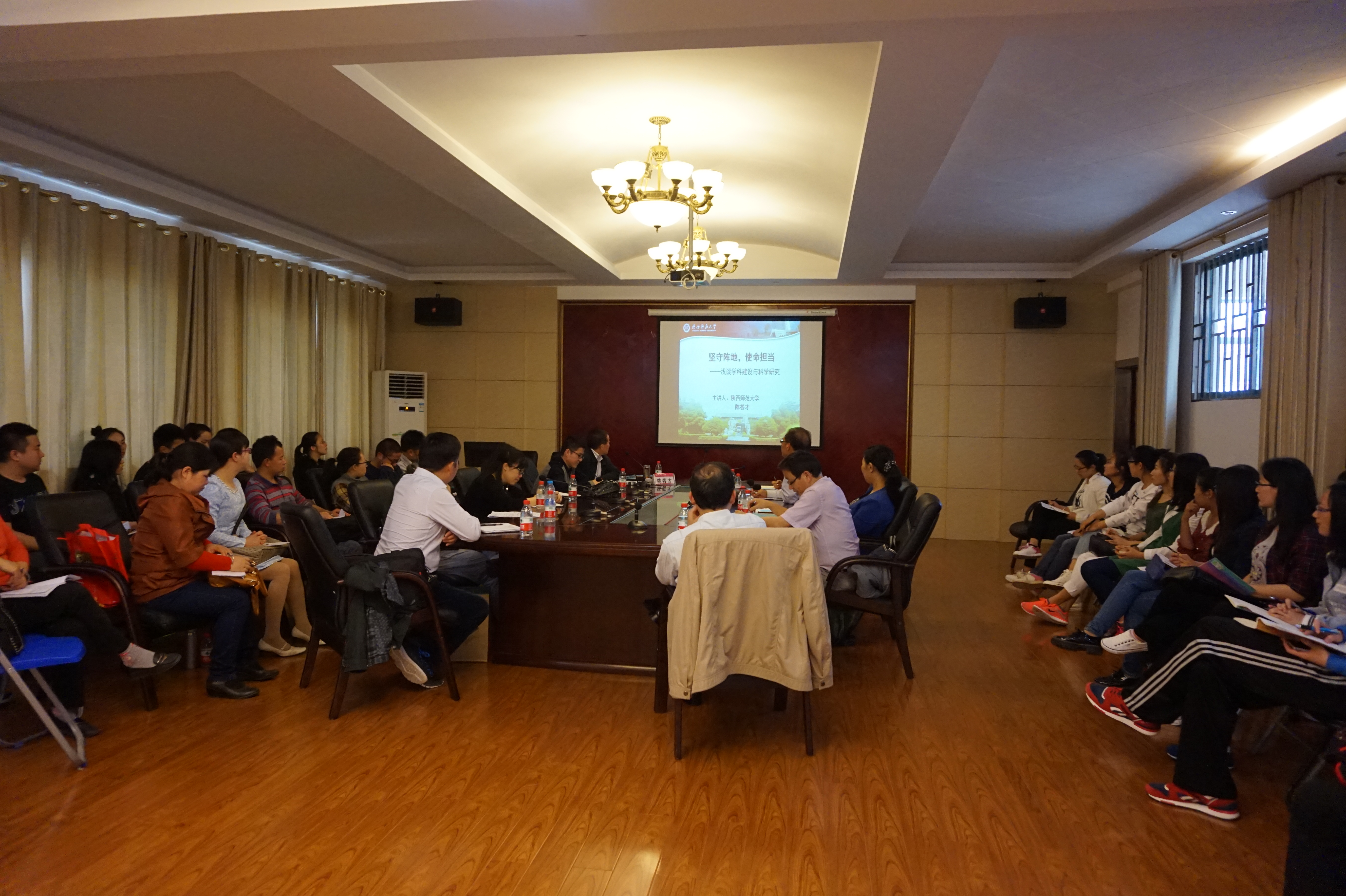 高校思想政治理论课建设是高校意识形态工作的重要组成部分,是高校宣传思想工作的主渠道。如何不断强化思想政治理论课教师的政治意识、责任意识、阵地意识和底线意识,自觉把握思想政治理论课的特性及其功能,发挥好高校思想政治理论课主阵地和主渠道的作用,牢牢掌握高校意识形态工作的领导权、话语权。4月19日下午,学院邀请陕西师范大学博士生导师陈答才教授在雁山校区文德楼325会议室作了题为“坚守阵地,使命担当“的报告。院长邱杰主持会议,学院全体教师及研究生参加了此次报告会。