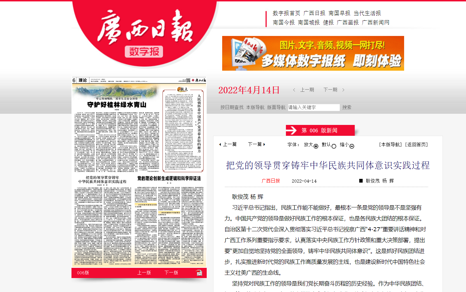2022年4月14日,十大买球官网2020级研究生杨辉在《广西日报》第6版(理论)发表理论文章:《把党的领导贯穿铸牢中华民族共同体意识实践过程》。历年来,十大买球官网高度重视学科建设与人才培养,积极打造党建+特色品牌,积极引导学院师生党员将专业知识融入党建特色实践活动中,理论与实践相结合,学以致用,在实践中提升理论素养和专业技能。