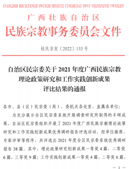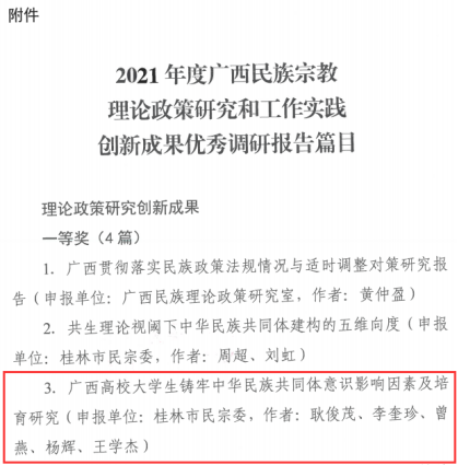 近日,自治区民宗委揭晓了2021年度广西民族宗教理论政策研究和工作实践创新成果评比结果,十大买球官网党委书记耿俊茂教授撰写的调研报告《广西高校大学生铸牢中华民族共同体意识影响因素及培育研究》荣获2021年度广西民族宗教理论政策研究创新成果一等奖。