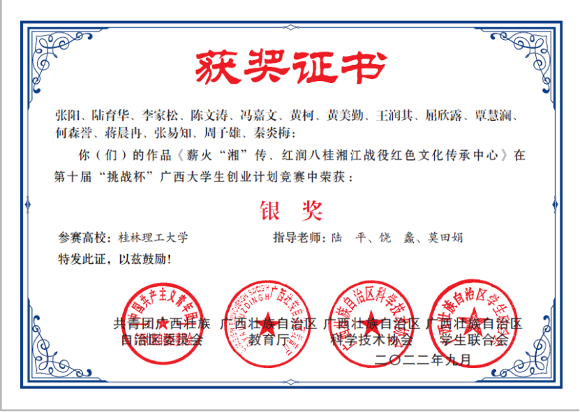 为深入贯彻落实国家双创工作部署,激发学院师生的创新精神,培育创业意识,提升创业能力,以优异的成绩迎接党的二十大胜利召开。十大买球官网认真组织学院师生参加第十届“挑战杯”广西大学生创业计划竞赛。近日,广西教育厅公布了大赛获奖名单,十大买球官网“薪火‘湘’传、红润八桂湘江战役红色文化传承中心”作品在此次竞赛中荣获银奖的好成绩。