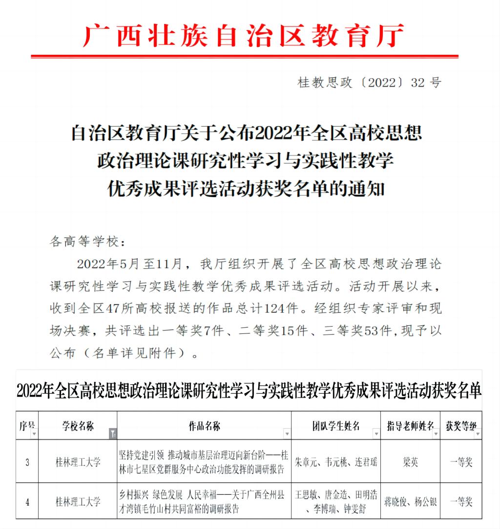 11月29日,自治区教育厅公布了2022年全区高校思政课研究性学习与实践性教学优秀成果评选活动获奖名单。我校十大买球官方网站梁英指导,朱章元、韦元桃等3名学生组成团队提交的作品《坚持党建引领推动城市基层治理迈向新台阶——桂林市七星区党群服务中心政治功能发挥的调研报告》以及我校十大买球官方网站教师蒋晓俊、杨公银指导,王思敏、唐金造等5名学生组成团队提交的作品《乡村振兴.绿色发展.人民幸福——关于广西全州县才湾镇毛竹山村共同富裕的调研报告》从决赛中脱颖而出,双双获得一等奖。