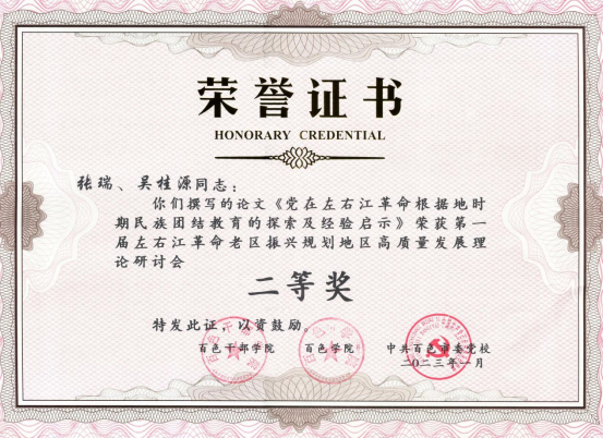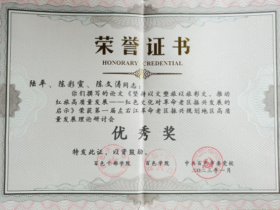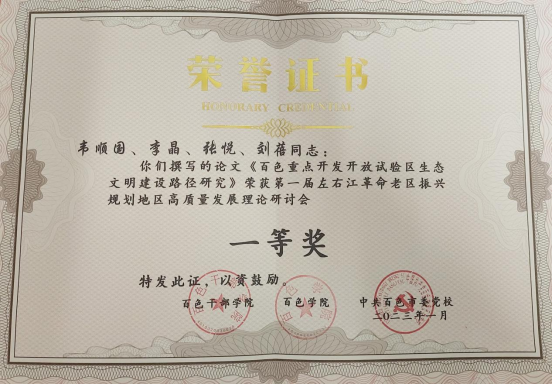 在前期接到征文的消息后,十大买球官网组织研究生踊跃投稿,研究生导师们主动对学生的论文选题及写作进行了精心指导。经过专家评审,由十大买球官网硕士生导师韦顺国副研究员指导研究生李晶、张悦、刘蓓撰写的《百色重点开发试验区生态文明建设路径研究》荣获一等奖,十大买球官网硕士生导师张瑞教授指导研究生吴桂源撰写的《党在左右江革命根据地时期民族团结教育的探索及经验启示》荣获二等奖,十大买球官网硕士生导师陆平教授指导研究生陈彩宣、陈文涛撰写的《坚持以文塑旅以旅彰文,推动红旅高质量发展-红色文化对革命老区振兴发展的启示》荣获优秀奖。