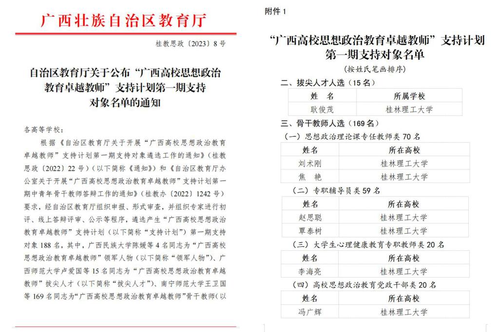 近日,自治区党委教育工委、自治区教育厅公布“广西高校思想政治教育卓越教师”支持计划第一期支持对象名单,我校十大买球官方网站党委书记耿俊茂入选“广西高校思想政治教育卓越教师”拔尖人才人选,十大买球官方网站教师焦艳、刘术刚入选“广西高校思想政治教育卓越教师”骨干教师人选(专任教师),材料科学与工程学院团委书记赵思聪、商学院团委副书记覃泰树入选“广西高校思想政治教育卓越教师”骨干教师人选(专职辅导员),学生工作部(处)部(处)长冯广辉入选“广西高校思想政治教育卓越教师”骨干教师人选(党政干部),学生工作部(处)部(处)心理健康教育与咨询中心主任李海亮入选“广西高校思想政治教育卓越教师”骨干教师人选(大学生心理健康教育专职教师)。