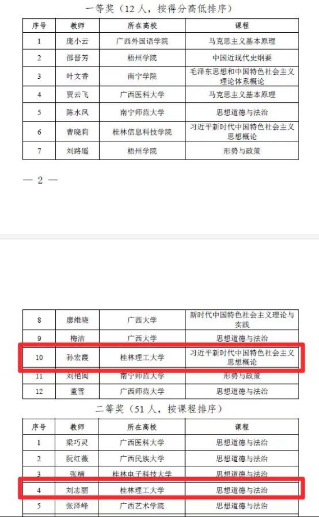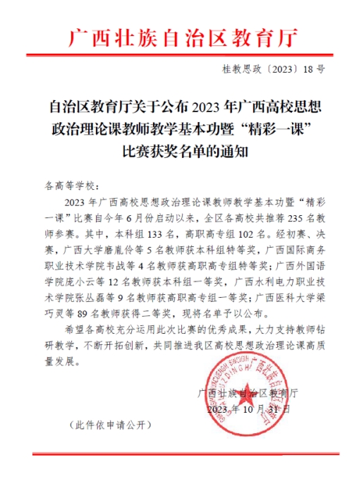 近日,自治区教育厅公布《2023年广西高校思想政治理论课教师教学基本功暨“精彩一课”比赛获奖名单的通知》,十大买球官网教师孙宏霞获得本科组一等奖,刘志丽、谢年华获得本科组二等奖。