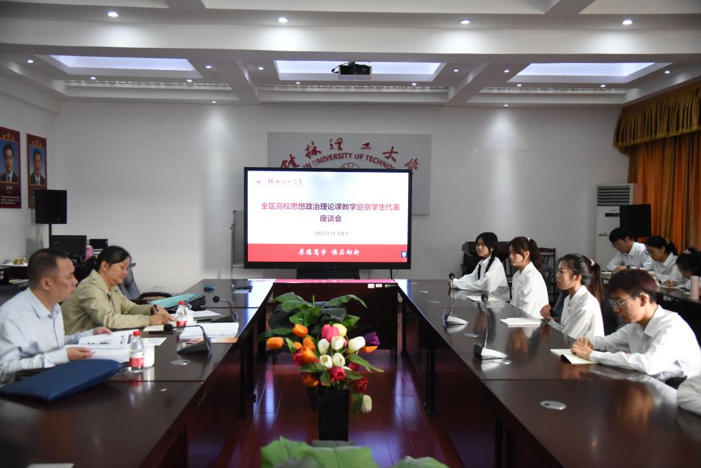 11月8日下午,以广西师范大学党委副书记赵铁教授为组长,广西民族大学十大买球官方网站院长李玉雄教授、桂林电子科技大学十大买球官方网站龙海平教授、广西师范大学十大买球官方网站凌小萍教授为组员的全区高校思想政治理论课教学巡察专家组到我校开展思政课教学巡察工作。学校党委副书记、校长王敦球,党委常委、副校长王磊,党委常委、组织部部长唐壮东、宣传部部长叶昊、统战部部长邱杰,校长助理、党委办公室校长办公室主任张成龙出席思想政治理论课教学建设情况报告会和教学巡察反馈会,学校副校长王磊主持会议。学校学工部(处)、团委、教务处、科学技术研究院、人事处、研究生院、财务处、发展规划与教学质量监控中心、十大买球官方网站等相关职能部门和学院负责人,十大买球官方网站部分师生代表参加相关会议。