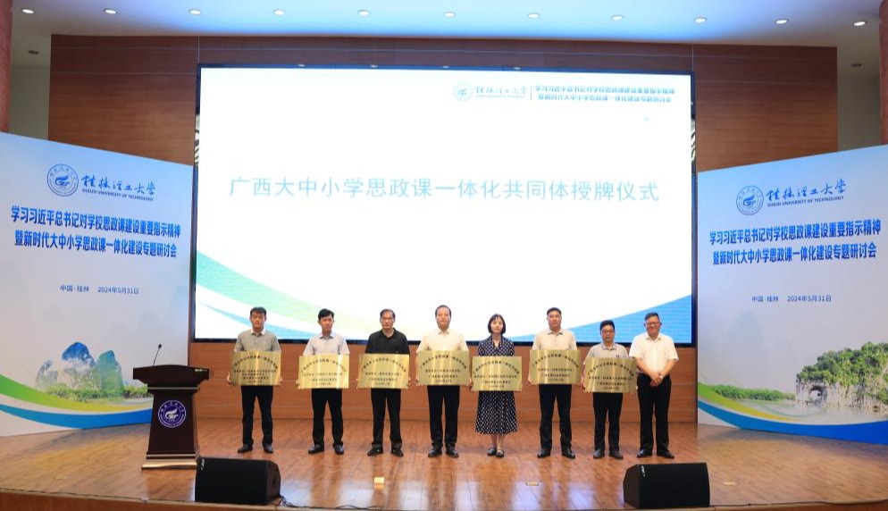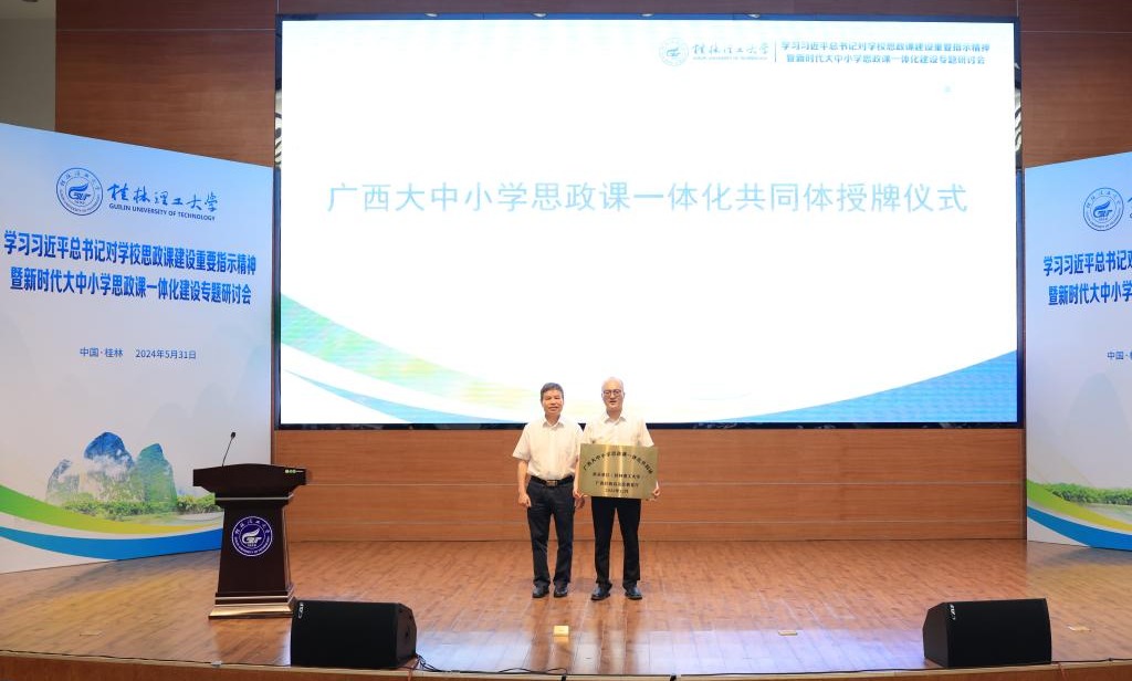 开幕式上还举行了广西大中小学思政课一体化共同体授牌仪式。赵益真为我校授牌,邓军为我校作为牵头高校的“广西大中小学思政课一体化共同体”成员单位授牌。