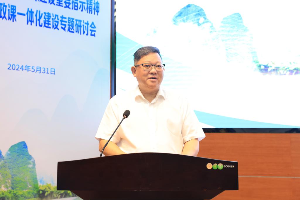 邓军代表学校对领导、专家学者的到来表示热烈的欢迎和衷心的感谢,并介绍了学校的办学历史、办学成就及加强思政课建设的有力举措和经验成效。他表示,学校党委始终高度重视思政课建设,切实扛牢党委主体责任,采取有力有效措施,持续在创新主渠道教学、建设“大课堂”、搭建“大平台”、培育“大师资”、完善“大格局”上下功夫,打造了一批以教育部“大思政课”优质课程为代表的思政“金课”,建成了国家级、自治区级课程思政示范课17门,培育“出彩桂工·年度致敬”“与信仰对话”等300余项精品思政实践项目,与地方政府和行业企业共建“大思政课”实践教学基地535个。他指出,本次论坛聚焦深入贯彻落实习近平总书记对学校思政课建设重要指示精神,共同探讨思政课教育教学改革创新和大中小思政课一体化建设的理论和实践问题,对守正创新推动思政课建设内涵式发展,加快构建新时代大思政课育人格局具有十分重要的意义。