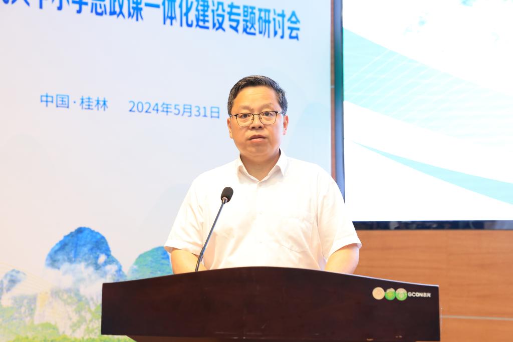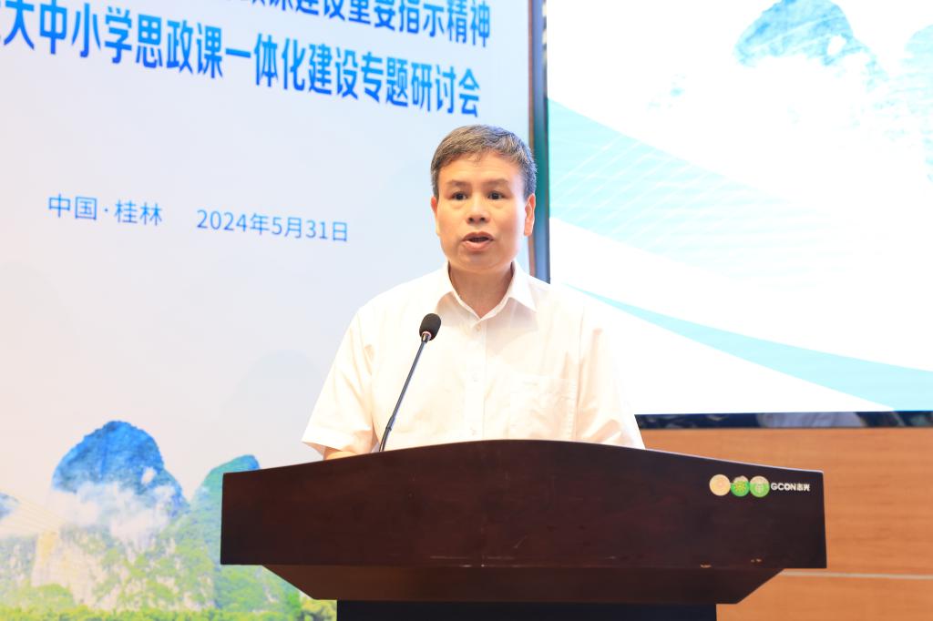赵益真在致辞中对研讨会的顺利举办表示祝贺。他指出,在习近平总书记主持召开学校思想政治理论课教师座谈会五周年之际,近期习近平总书记再次围绕学校思政课建设作出重要指示,为推进新时代思政课建设、推进大中小学思想政治教育一体化建设指明了前进方向,提供了根本遵循,举办此次研讨会非常及时,也非常必要。他从构建大中小一体化工作格局、抓教学资源、抓队伍建设三个方面详细介绍了自治区党委教育工委、自治区教育厅在贯彻落实习近平总书记关于学校思政课建设重要指示精神、推动大中小学思政课一体化建设的情况。他指出,广西大中小学思政课一体化建设战线长、任务重,希望与会人员积极探索思政课一体化建设中的全面性、理论性、实践性问题和关键性难题,向全国有影响力的一体化共同体学习先进经验,产出更多理论和实践成果,为大中小思政课一体化建设提供广西方案、广西经验、广西亮点。