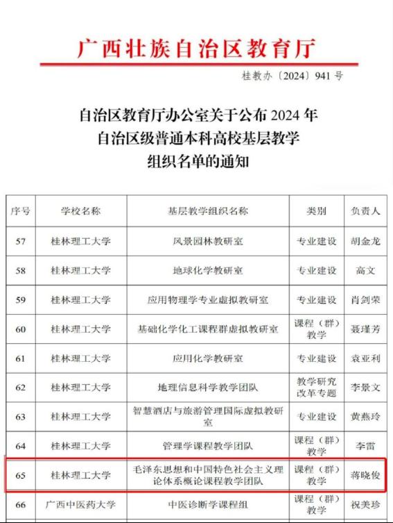 近日,自治区教育厅办公室正式公布了2024年自治区级普通本科高校基层教学组织的评选结果,十大买球官网再传喜报!由蒋晓俊教授领衔的“毛泽东思想和中国特色社会主义理论体系概论”课程教学团队,凭借其出色的教学质量、创新的教学方法以及对课程思政理念的深度融入,成功获评自治区级普通本科高校基层教学组织。