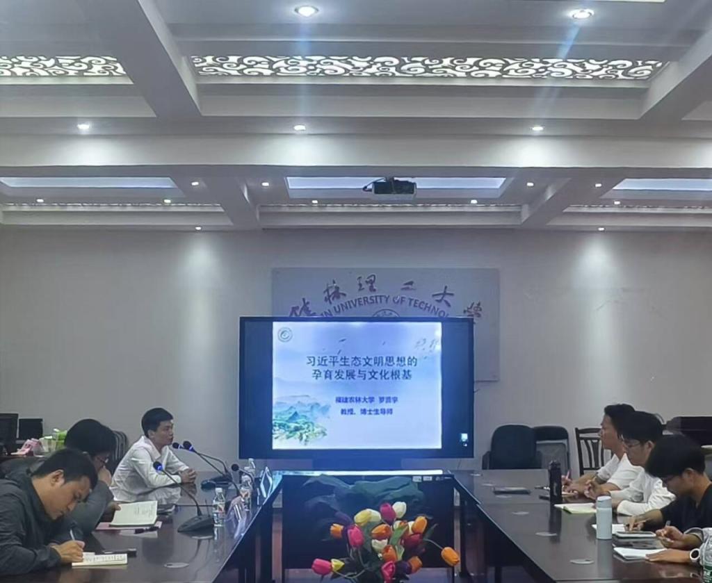 讲座中,罗贤宇教授以“什么是生态文明、为何要建设生态文明、怎样建设生态文明”为切入点展开讲座。他以福建为例,陈述了习近平生态文明思想的孕育过程,并着重对“绿水青山就是金山银山”和习近平生态文明思想“八大观”理念进行解读。随后罗教授阐释了习近平生态文明思想当中的优秀传统文化根基。他指出,“天人合一”思想作为中华优秀传统文化的重要组成部分,为习近平生态文明思想的形成和发展提供了丰富的文化滋养。