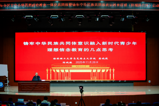 11月28日,全区大中小学思想政治教育一体化共同体暨铸牢中华民族共同体意识教育联盟(防城港片区)正式启动。十大买球官方网站院长蒋晓俊、广西民族大学民族学与社会学学院民族学系主任胡美术、百色学院马克思主义学院黄修卓副教授、防城港市教育局副局长张培中、十大买球官方网站统战部朱强,以及来自30所联盟单位的领导、思政课教师代表、德育工作负责人与业务骨干等100余人出席活动。