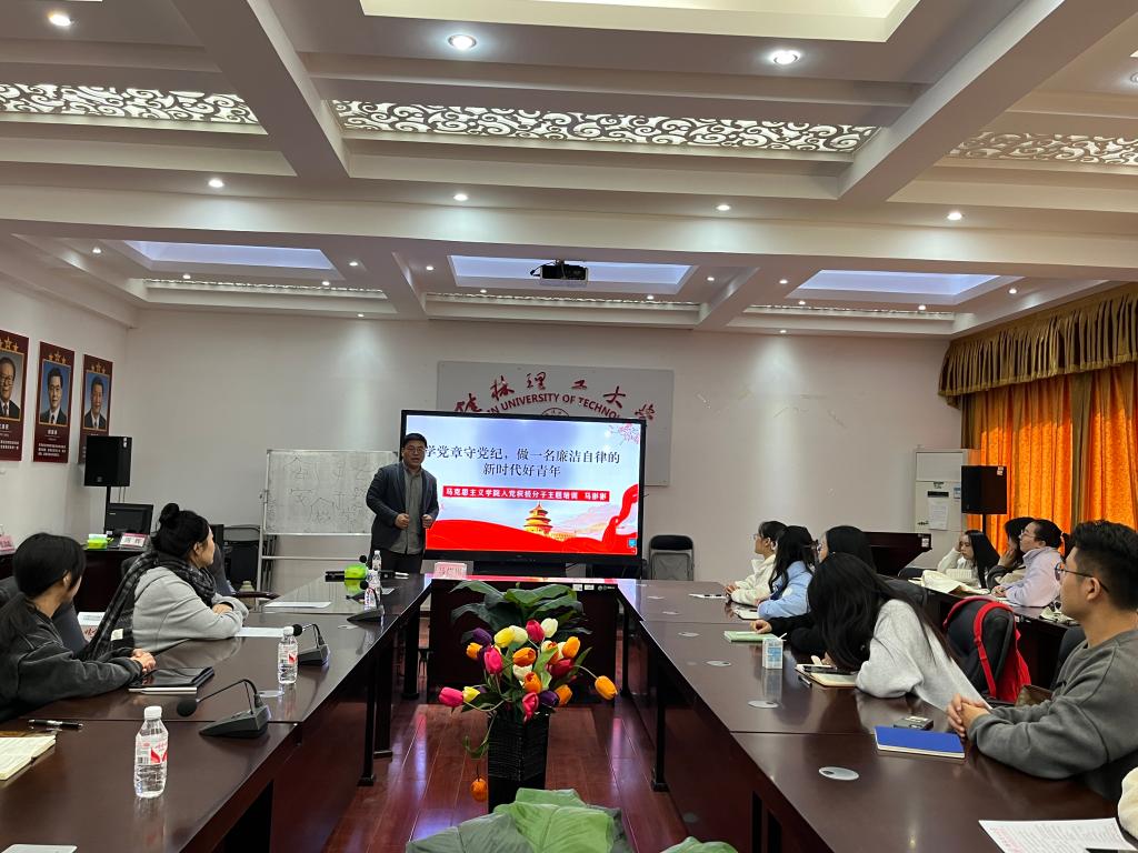 当天下午,马彬彬为全体学员讲授了《学党章守党纪,做一名廉洁自律的新时代好青年》的专题党课。在党课中,他带领全体入党积极分子深入学习了《中国共产党章程》《中国共产党纪律处分条例》的内容,强调了党章的重要性和党纪的严肃性,引导全体入党积极分子要加强思想政治理论学习,时刻牢记党规党纪,积极锤炼党性,严守党的纪律、严格做到廉洁自律。