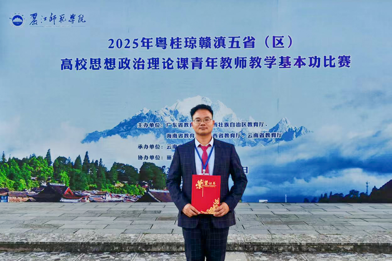 近日,2025年粤桂琼赣滇五省(区)高校思想政治理论课青年教师教学基本功比赛在丽江师范学院落下帷幕。我校十大买球官方网站教师梁新堂以扎实的理论储备、创新的教学设计及优异的现场发挥,在本科组比拼中斩获三等奖,充分彰显了我校青年思政课教师的卓越素质与教学风范,这亦是我校首次在该类竞赛中取得突破。