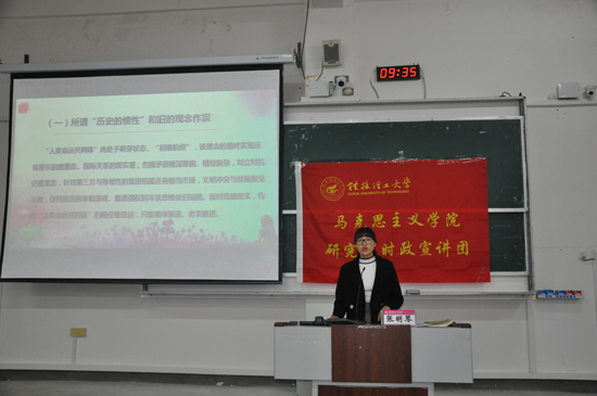 在宣讲过程中,张明琴同学以党的十九大报告文本为基础,细致讲述了“人类命运共同体”思想的形成过程及原因及新时代对构建人类命运共同体的要求和需要达到的目标,分析了新时代构建人类命运共同体思想所面临的挑战,同时也重点讲述了中国为构建人类命运共同体所实施的经济上和文化上的方案。最后,将视角回归到学生,以90后女孩许吉如的《国强则少年强》演讲视频让学生感受国强带给国民的优越感和安全感,同时激励学生奋发图强,积极上进。