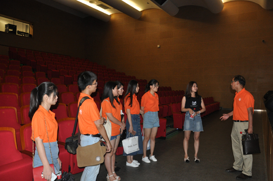 随后,实践团成员参观考察了桂林大剧院。成员们一同观看了桂林“一院两馆”的发展进程视频材料,了解到桂林大剧院作为桂林市临桂新区核心区的标志性建筑之一,发挥着最大的综合性表演艺术功能,其配置能满足歌舞剧、话剧、音乐会、演唱会等一系列演出要求。在负责人的解说下,实践团成员参观了大剧院的主剧场、小剧场以及演员排练厅、化妆厅和剧院大厅休息厅等场所。