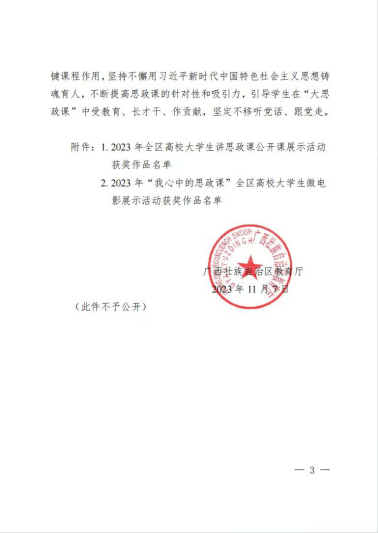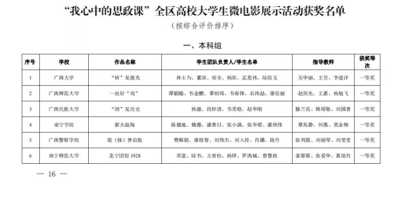 据悉,本次比赛自今年6月启动以来,经各高校推荐,教育厅组织专家评审,认定全区高校大学生讲思政课公开课展示活动优秀作品108件,其中,本科组一等奖7件、二等奖15件、三等奖31件;高职组一等奖7件、二等奖15件、三等奖33件。认定“我心中的思政课”全区高校大学生微电影展示活动优秀作品103部,其中,本科组一等奖6部、二等奖11部、三等奖37部;高职组一等奖6部、二等奖10部、三等奖33部。
