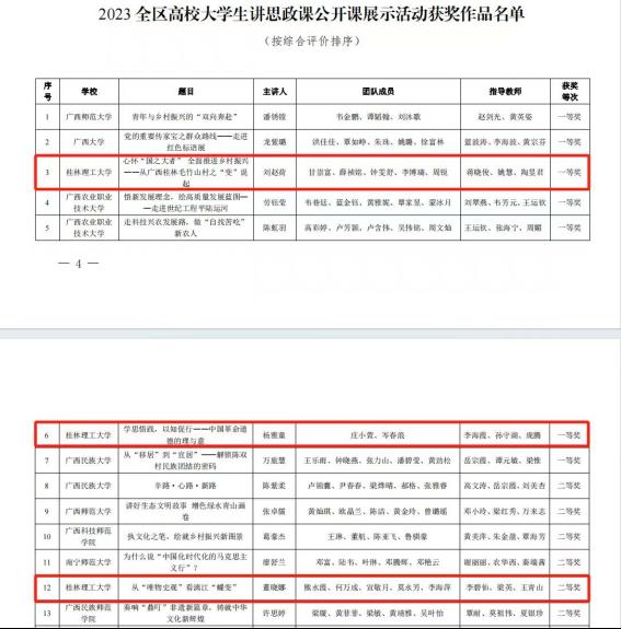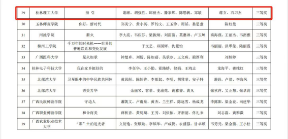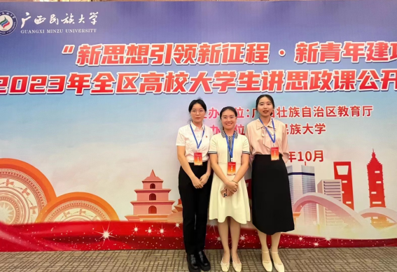 在第七届全区高校大学生讲思政课活动中,十大买球官网硕士研究生刘赵荷主讲的课程《心怀“国之大者”全面推进乡村振兴——从广西桂林毛竹山村之变说起》(指导老师:蒋晓俊、姚慧、陶昱君)荣获大赛一等奖,硕士研究生杨雅童主讲的课程《学思悟践,以知促行—中国革命道德理与义》(指导老师:李海霞、孙守湖、庞腾)荣获大赛一等奖,硕士研究生董晓娜主讲的课程《从“唯物史观”看漓江“蝶变”》(指导老师:李碧仙、梁英、王青山)荣获大赛二等奖。