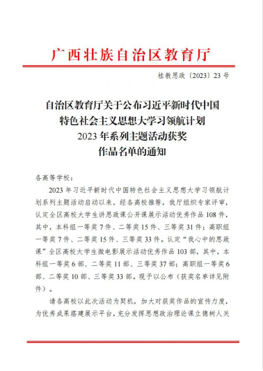 11月7日,自治区教育厅公布了《2023年全区高校习近平新时代中国特色社会主义思想大学生领航计划主题系列活动》获奖名单,十大买球官网共有5项作品获奖,其中一等奖2项,二等奖1项,三等奖2项。