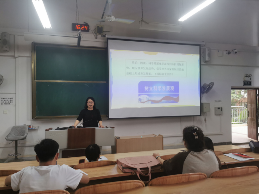 磨课第一环节,阳倩倩副教授以“中国特色社会主义理论体系形成发展的社会历史条件”为主题进行教学展示。阳老师从国际背景、历史条件、实践基础三个维度系统介绍了中国特色社会主义理论体系形成的时代和背景;科学判断了党和国家发展所处历史方位;深刻阐述了中国特色社会主义理论体系是在我们党领导的改革开放和社会主义现代化建设的生动实践中形成并不断发展的。教学展示结束后,教师们围绕其教学设计、重难点突破、内容衔接、互动方法等方面进行深入交流和讨论。